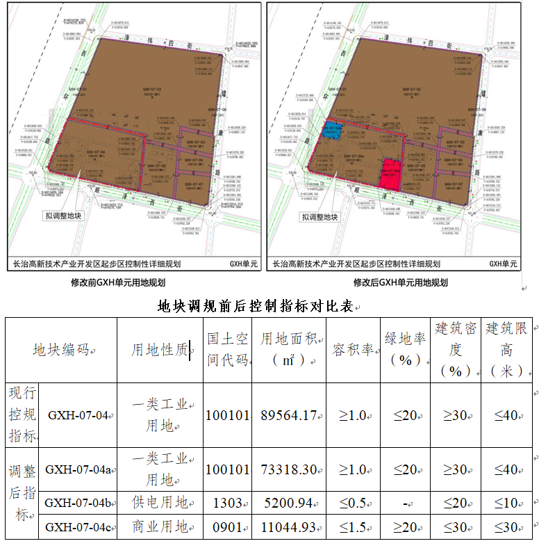 结合高新区产业园区发展需求,将GXH-07-04地块由一类工业用地细分为三个小地块,分别为:GXH-07-04a地块为一类工业用地(100101/M1)、GXH-07-04b地块为供电用地(1303/U1)、GXH-07-04c地块为商业用地(0901/B1)。并结合项目实际发展需求和用地性质修改对用地控制指标进行适当的修改。