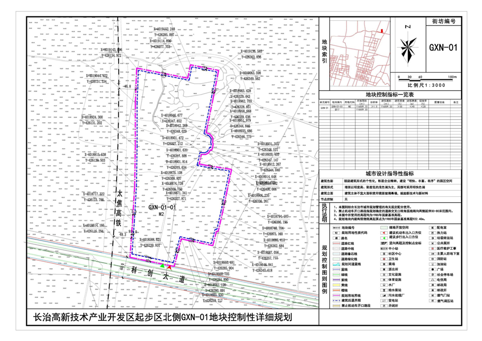 本场地规划地块为长治市高新区起步区北侧,未纳入高新区控规编制范围内。然而,长治市在招商引资过程中引进投资企业拟选GXN-01地块作为项目建设用地,同时地块在长治市国土空间规划中将地块划入城镇建设用地,项目建设符合城市发展建设要求。为解决实际问题,有效的开发相应土地,特编制《长治高新技术产业开发区起步区北侧GXN-01地块控制性详细规划》