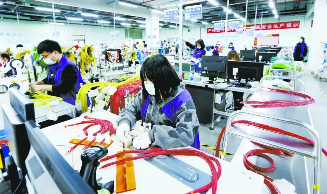 立讯精密二期项目生产车间内,工人在流水线上进行产品组装